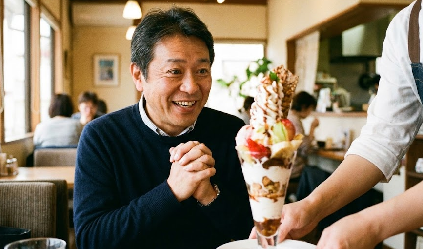 「本当は季節限定のいちごパフェが食べたい。でも、おじさんが一人で頼むのは痛すぎる…」