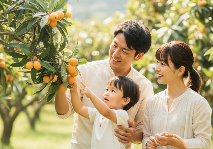 - びわ狩り:しっとりとした大人の味わいどこかノスタルジックで、上品な甘さが魅力のびわ。スーパーではプラスチックのケースに守られて、少しだけ澄まして並んでいるイメージですが、木になっている姿は、太陽の光をいっぱいに浴びて、生命力に溢れています。薄い皮をそっと剥いたときに広がる、みずみずしくて優しい香り。栽培されているエリアが限られているからこその特別感も、旅の目的として心をくすぐります。「今年は、びわ狩りに行ってきたんだ」なんて一言が、あなたのセンスの良さをさりげなく伝えてくれるかもしれません。