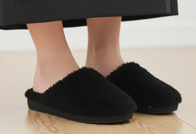 足元対策: ストッキングは「フェイクタイツ(ベージュ)」で素肌感と防寒を両立。パンツなら中にレギンスを。スリッパは「厚底」を選び、足裏にカイロを貼る。