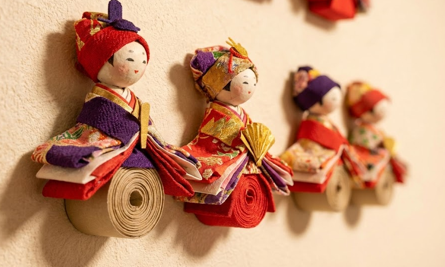 そこでおすすめなのが、無理に人形本体(特に顔)を作ろうとせず、「吊るし雛(つるしびな)」や「桃の花」「扇(おうぎ)」といったモチーフで壁一面を構成するアプローチです。
