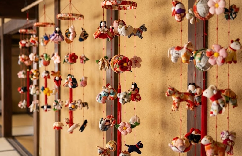 吊るし雛は、江戸時代から続く伝統的な飾りで、「衣食住に困らないように」との願いを込めて、小さな人形や縁起物を吊るすものです。