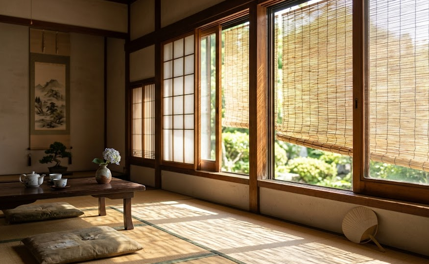 窓の内側でカーテンを閉めるよりも、窓の「外側」で熱を遮るすだれのほうが、遮熱効果ははるかに高いと言われています。