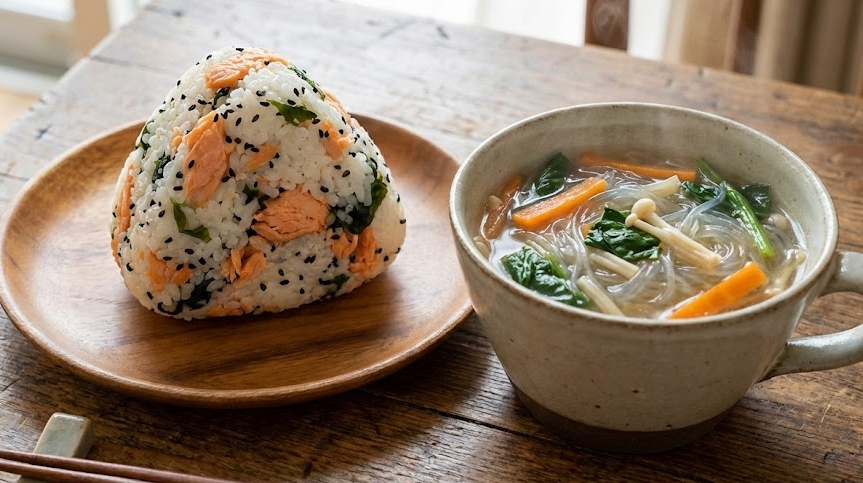 栄養バランスは「具沢山おにぎり」+「春雨スープ」で解決